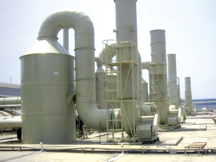 填料式噴淋塔采用二段逆流噴淋。氣體由風(fēng)機(jī)吸入凈化塔底部并向上流動(dòng),由噴咀噴出的水溶液向下噴淋,從凈化塔第一級(jí)噴出的水溶液與上升的氣體進(jìn)行氣液充分接觸,吸收中和后的液體往下濕淋第二級(jí)濾料層,使從下往上升的氣體得到氣液接觸再次吸收溶解,水溶液再向下濕淋第二級(jí)濾料層,再一次獲得氣液相接觸吸收溶解的作用,從而加大了該濾料層的氣液接觸的時(shí)間,使氣體通過(guò)濾料層后的廢氣中污染物濃度急劇下降,正因?yàn)槲廴疚餁怏w是自下往上升,通過(guò)第二級(jí)濾料層的污染物濃度高,這樣使高濃度的氣體曲折的從濾料間隙通過(guò)向上升時(shí),與向下流動(dòng)的水溶液接觸吸收溶解,氣體通過(guò)該濾料層后濃度急劇下降再經(jīng)過(guò)一排水溶液噴淋,氣體與吸收液溶解后,濃度急劇下降,然后再經(jīng)過(guò)一級(jí)濾料層和一級(jí)液噴淋的接觸吸收溶解,使氣體的濃度凈化后達(dá)到設(shè)計(jì)規(guī)定要求。凈化氣體通過(guò)氣液分離層,去除掉氣體中夾帶的水滴,經(jīng)風(fēng)管排入煙囪。